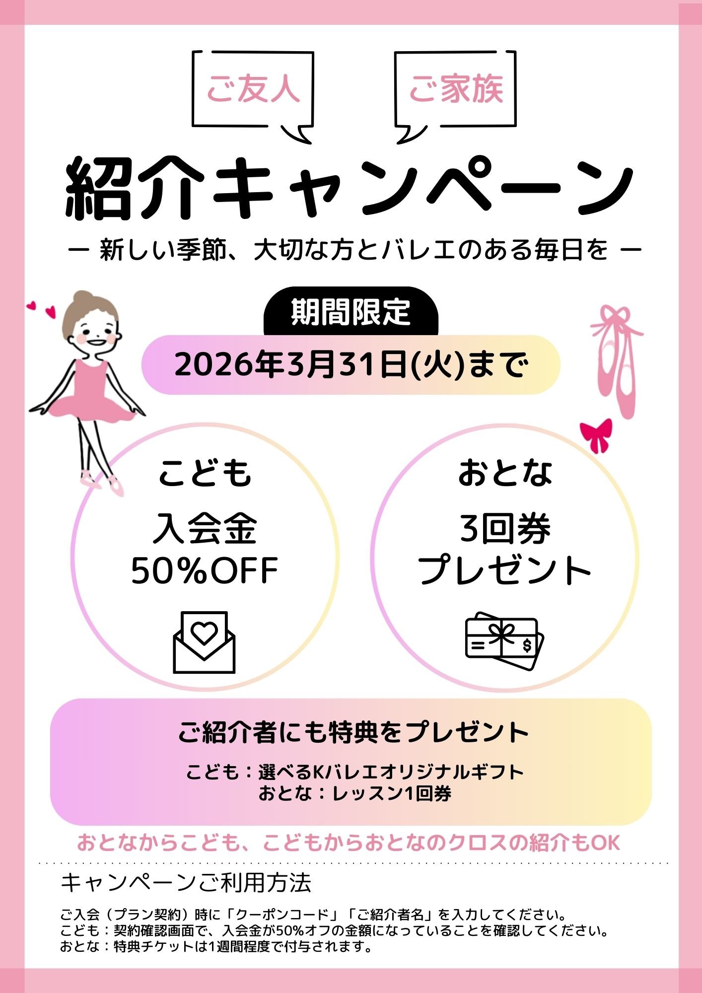 ご入会のお申し込み時に、クーポンコード「kodomo2026S」と「ご紹介者のお名前」をご入力・ご記入ください。
