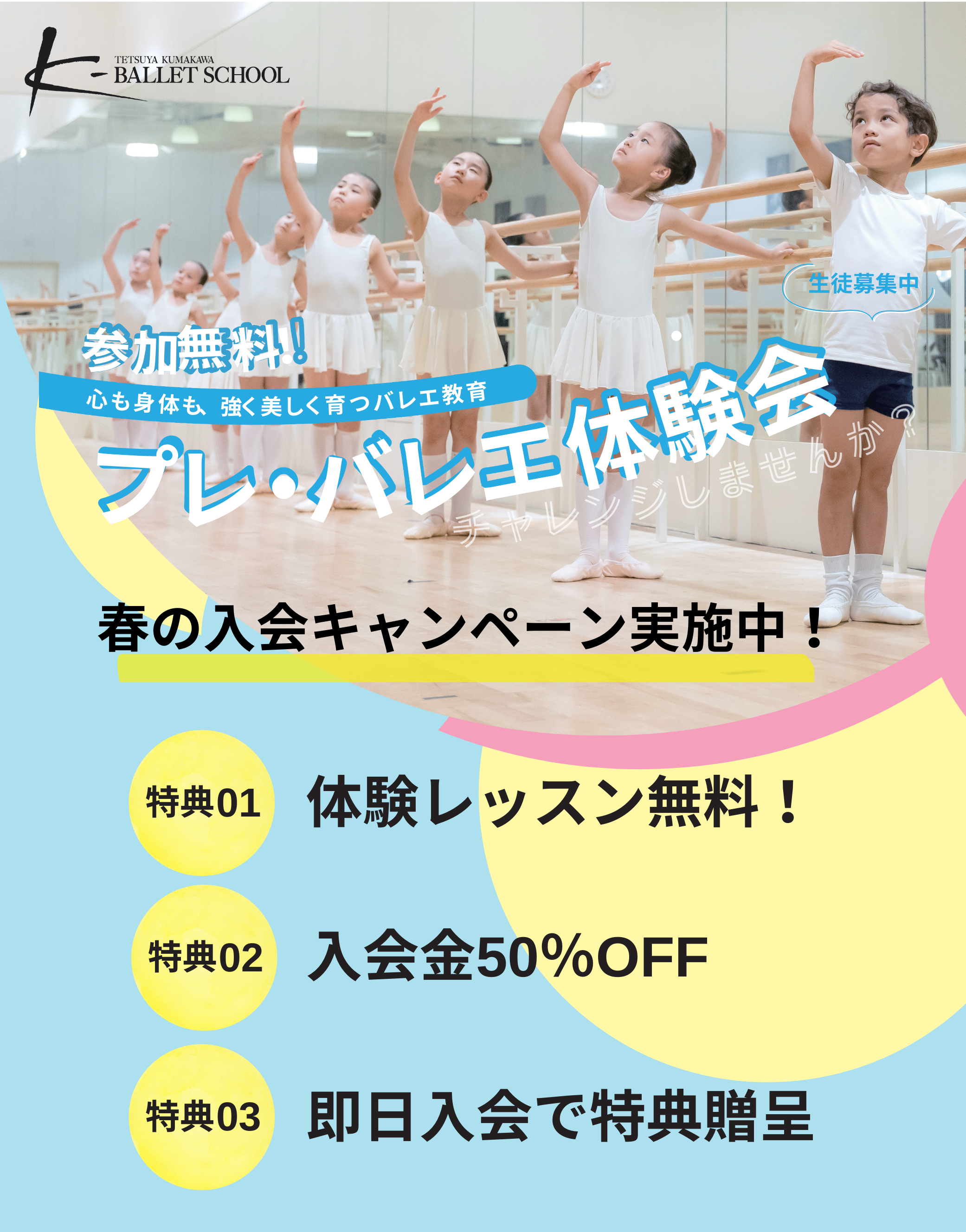 Kバレエ スクールでは、子供プログラムにてプレ・バレエ体験会「やってみよう!バレエ体験」と春の入会キャンペーンを全校で実施いたします。ピアノの生演奏に合わせて体を動かすことで、バレエの基本的な動きや姿勢を、自然に楽しく体験していただけます。